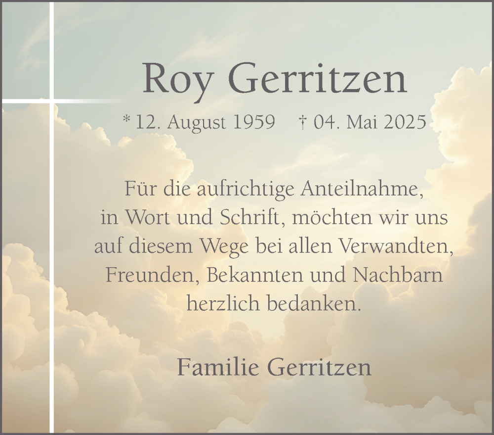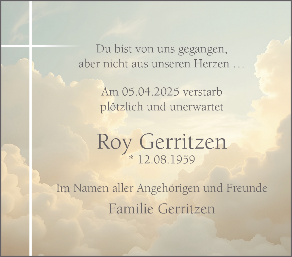Hier finden Sie alle Traueranzeigen aus der Zeitung, die bisher für Roy Gerritzen erschienen sind. Weitere Traueranzeigen, die in der Zeitung erscheinen, werden hier ebenfalls aufgelistet