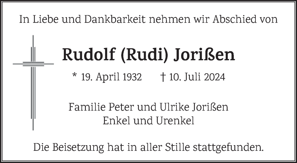 Hier finden Sie alle Traueranzeigen aus der Zeitung, die bisher für Rudolf Jorißen erschienen sind. Weitere Traueranzeigen, die in der Zeitung erscheinen, werden hier ebenfalls aufgelistet