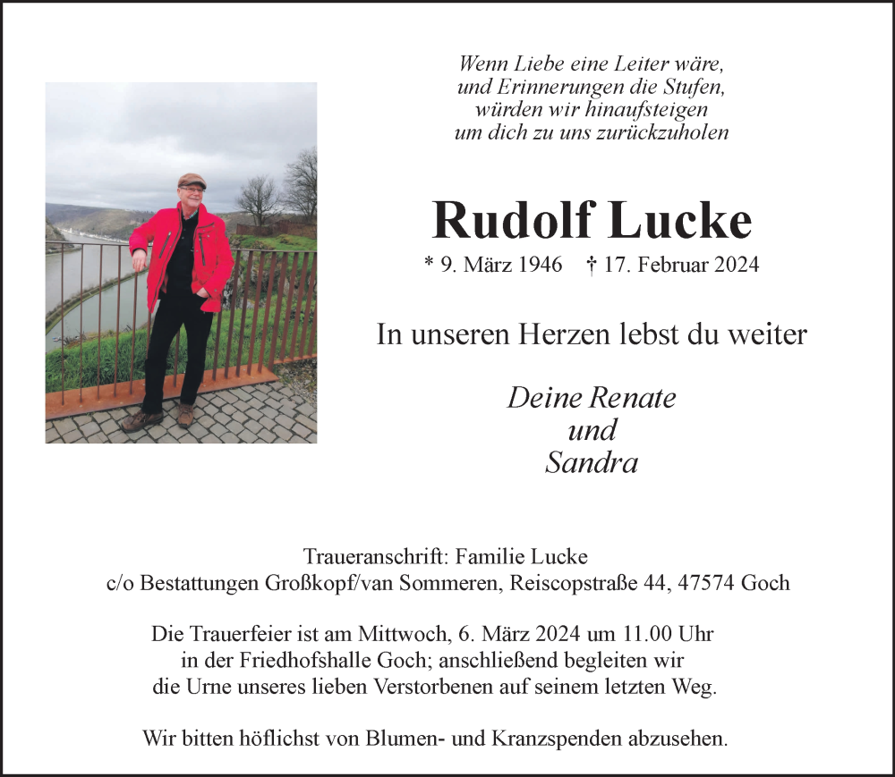Hier finden Sie alle Traueranzeigen aus der Zeitung, die bisher für Rudolf Lucke erschienen sind. Weitere Traueranzeigen, die in der Zeitung erscheinen, werden hier ebenfalls aufgelistet