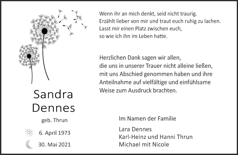 Hier finden Sie alle Traueranzeigen aus der Zeitung, die bisher für Sandra Dennes erschienen sind. Weitere Traueranzeigen, die in der Zeitung erscheinen, werden hier ebenfalls aufgelistet