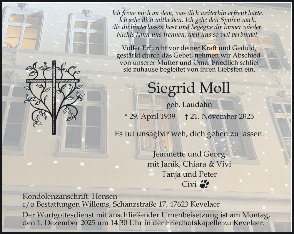Hier finden Sie alle Traueranzeigen aus der Zeitung, die bisher für Siegrid Moll erschienen sind. Weitere Traueranzeigen, die in der Zeitung erscheinen, werden hier ebenfalls aufgelistet