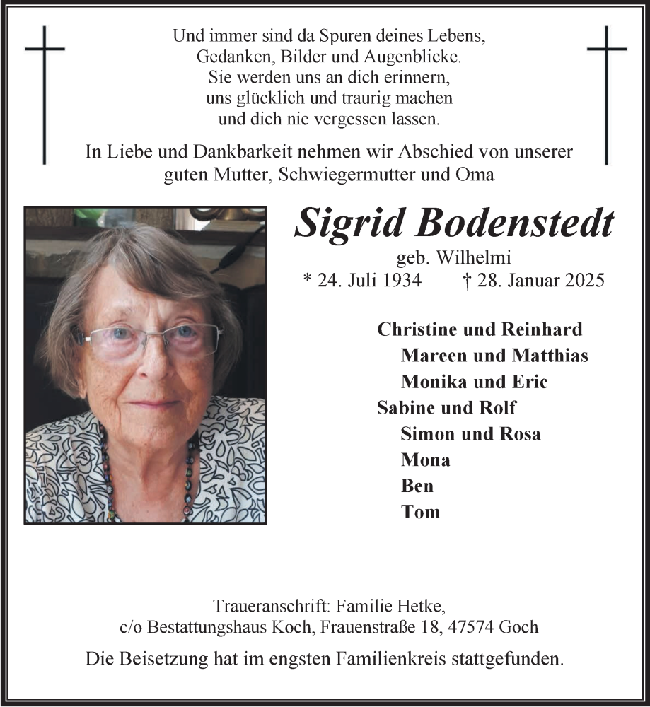 Hier finden Sie alle Traueranzeigen aus der Zeitung, die bisher für Sigrid Bodenstedt erschienen sind. Weitere Traueranzeigen, die in der Zeitung erscheinen, werden hier ebenfalls aufgelistet