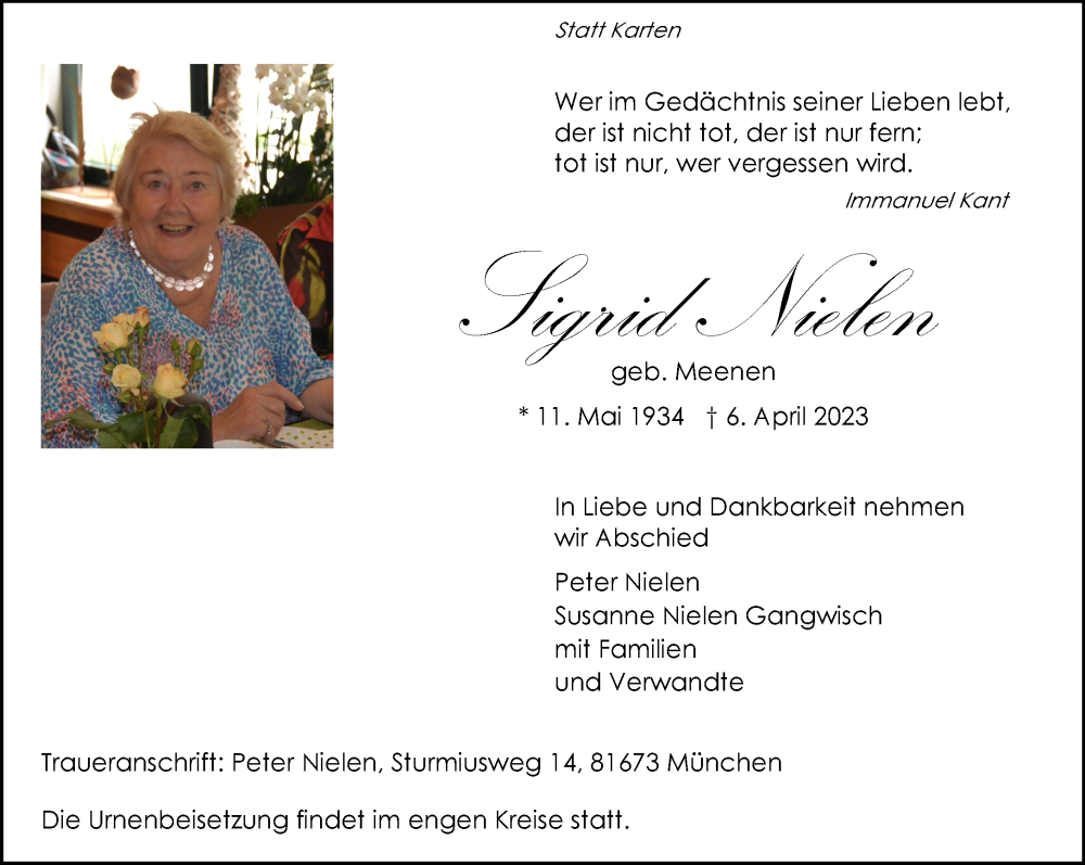 Hier finden Sie alle Traueranzeigen aus der Zeitung, die bisher für Sigrid Nielen erschienen sind. Weitere Traueranzeigen, die in der Zeitung erscheinen, werden hier ebenfalls aufgelistet