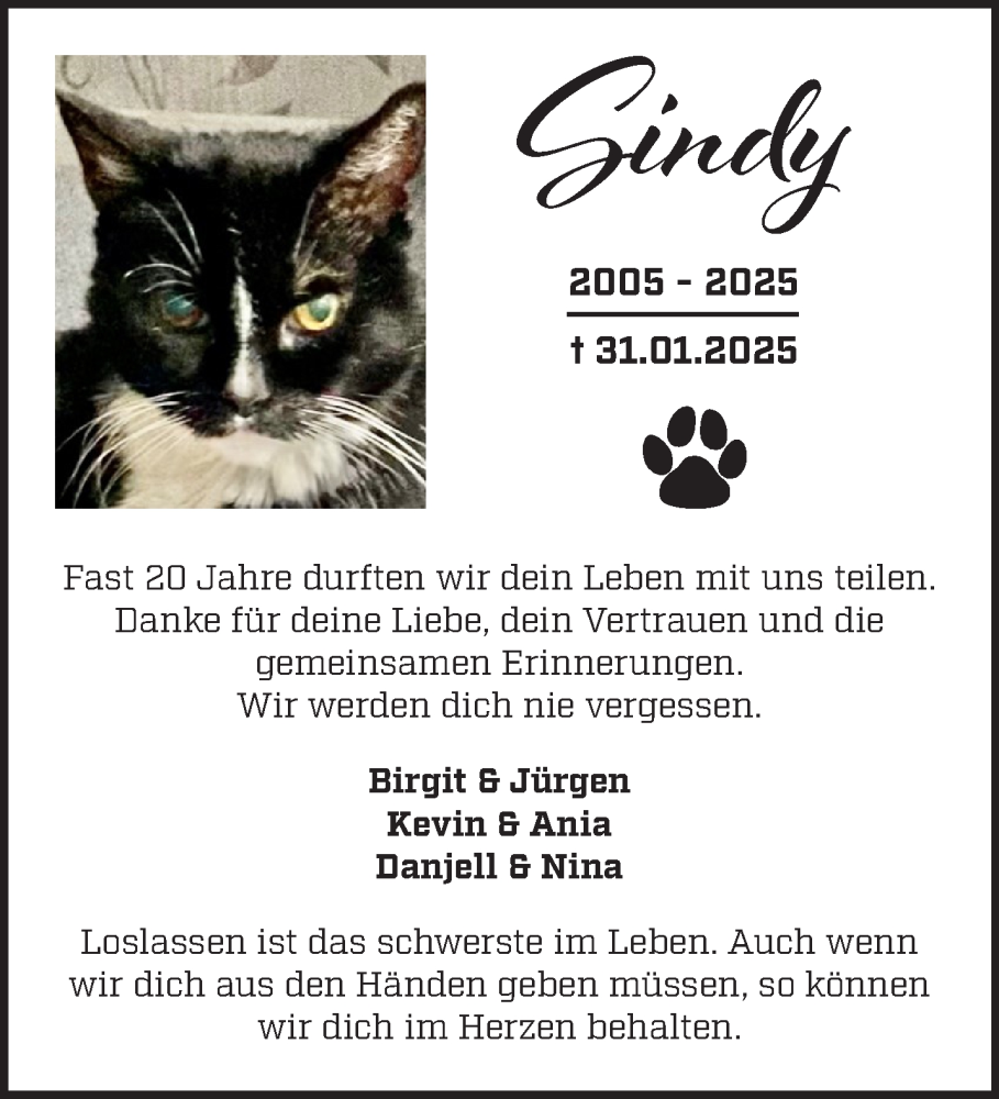 Hier finden Sie alle Traueranzeigen aus der Zeitung, die bisher für Sindy erschienen sind. Weitere Traueranzeigen, die in der Zeitung erscheinen, werden hier ebenfalls aufgelistet