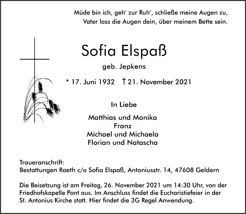 Hier finden Sie alle Traueranzeigen aus der Zeitung, die bisher für Sofia Elspaß erschienen sind. Weitere Traueranzeigen, die in der Zeitung erscheinen, werden hier ebenfalls aufgelistet