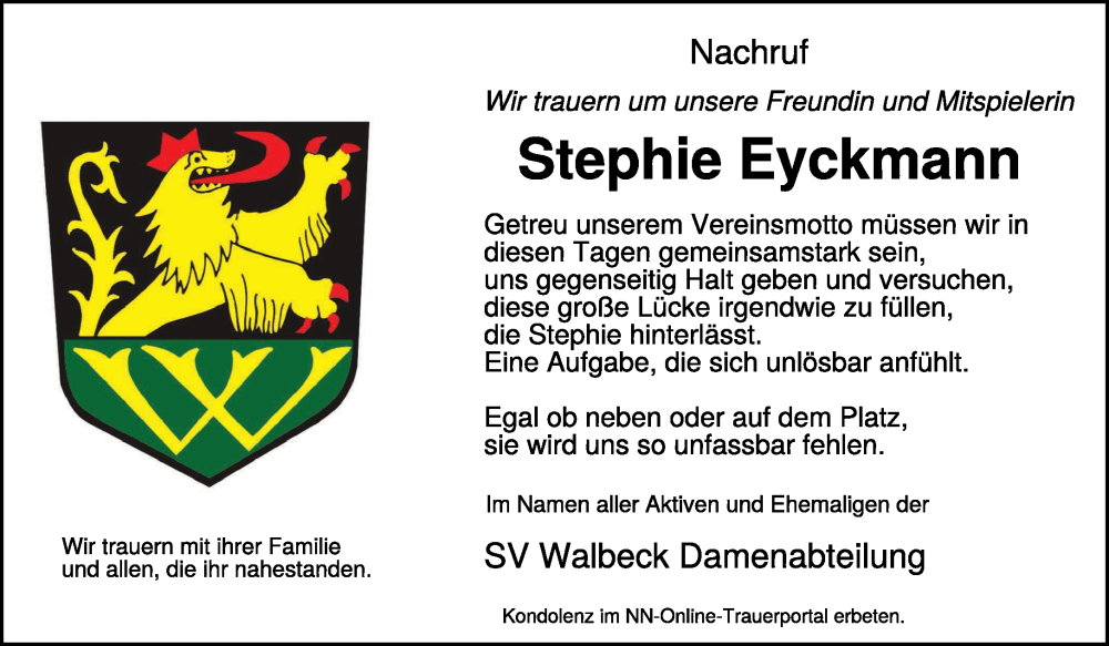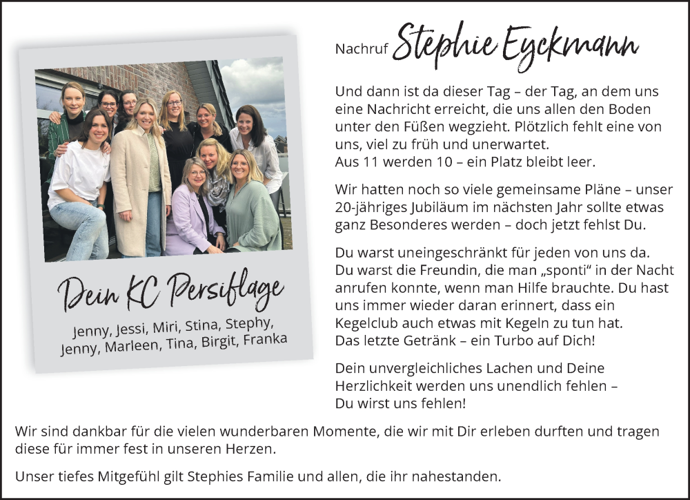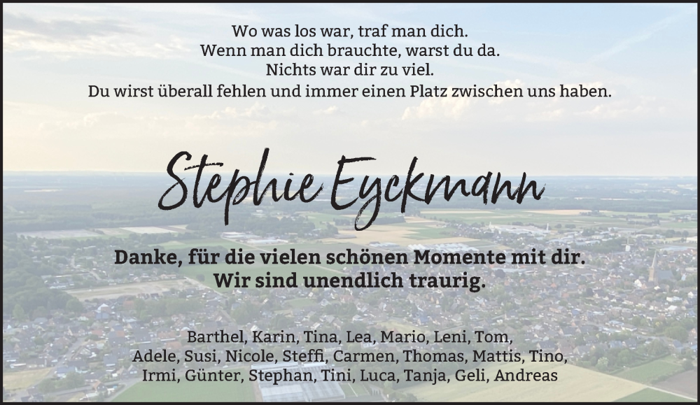 Hier finden Sie alle Traueranzeigen aus der Zeitung, die bisher für Stephie Eyckmann erschienen sind. Weitere Traueranzeigen, die in der Zeitung erscheinen, werden hier ebenfalls aufgelistet