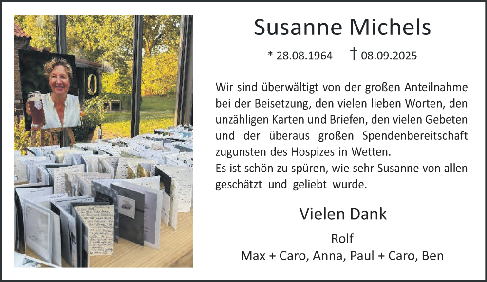 Hier finden Sie alle Traueranzeigen aus der Zeitung, die bisher für Susanne Michels erschienen sind. Weitere Traueranzeigen, die in der Zeitung erscheinen, werden hier ebenfalls aufgelistet