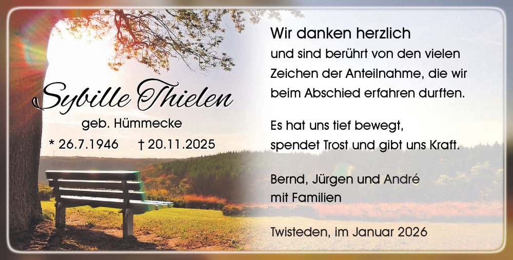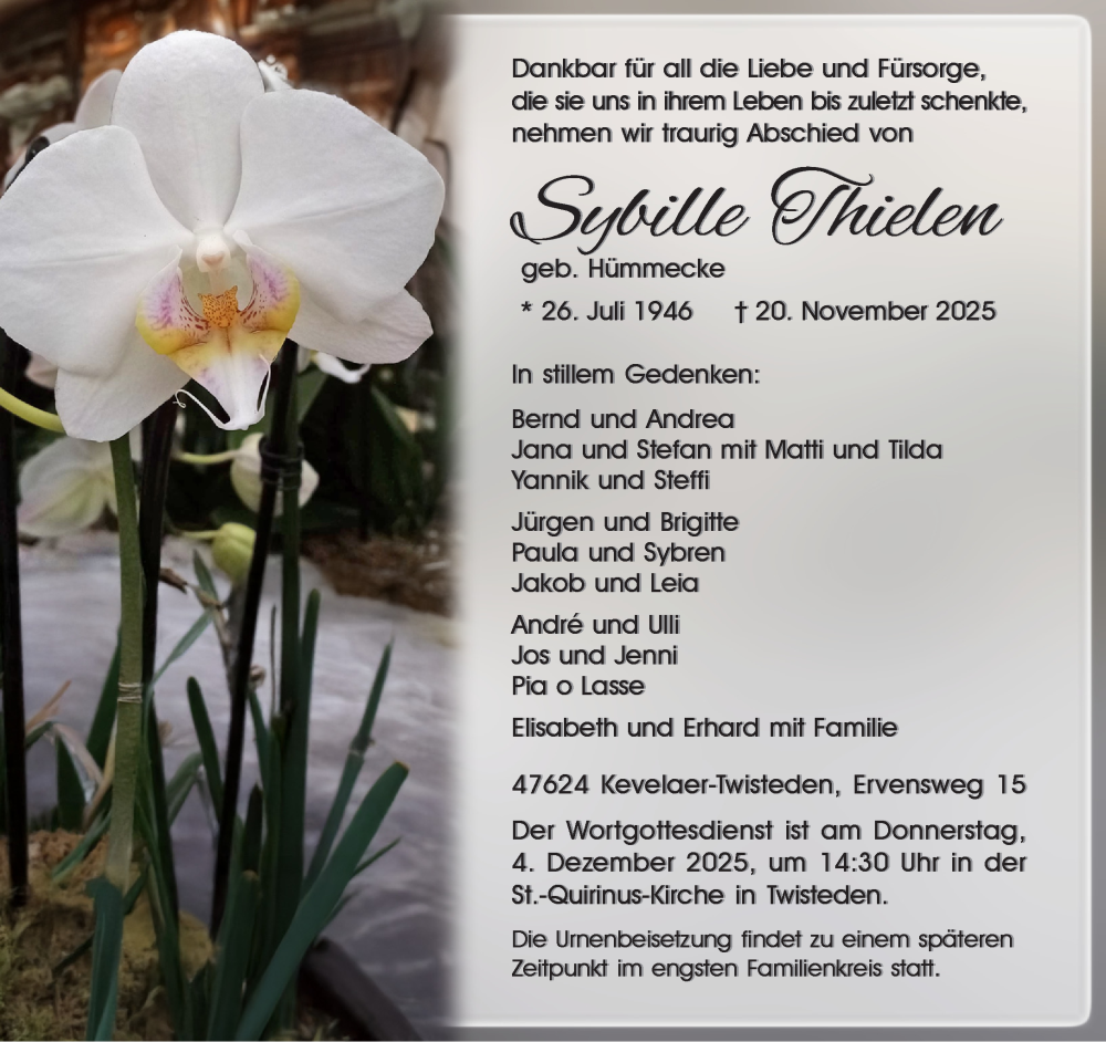Hier finden Sie alle Traueranzeigen aus der Zeitung, die bisher für Sybille Thielen erschienen sind. Weitere Traueranzeigen, die in der Zeitung erscheinen, werden hier ebenfalls aufgelistet