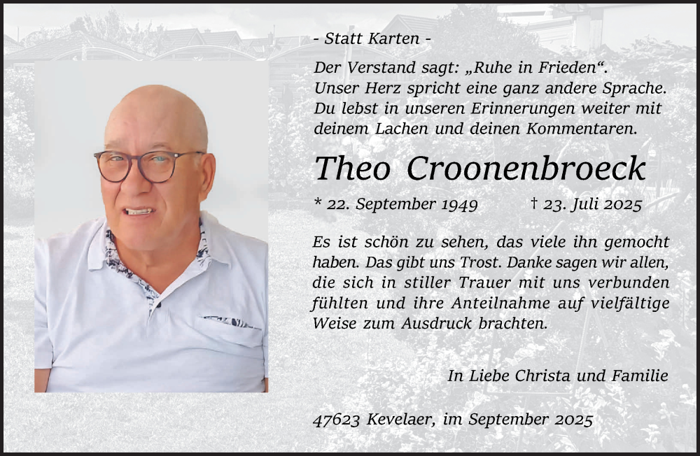 Hier finden Sie alle Traueranzeigen aus der Zeitung, die bisher für Theo Croonenbroeck erschienen sind. Weitere Traueranzeigen, die in der Zeitung erscheinen, werden hier ebenfalls aufgelistet