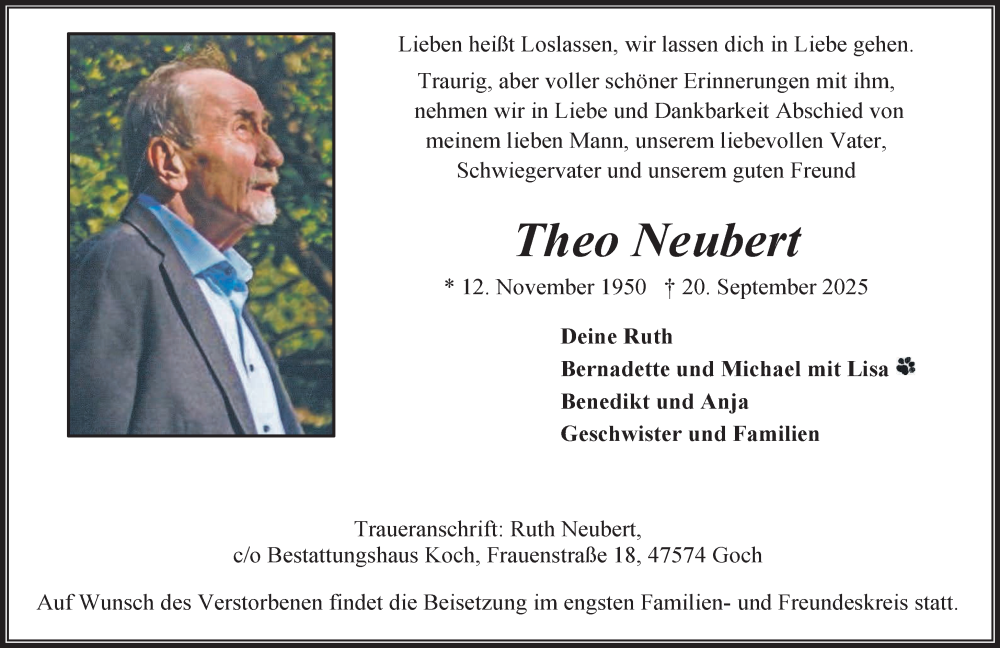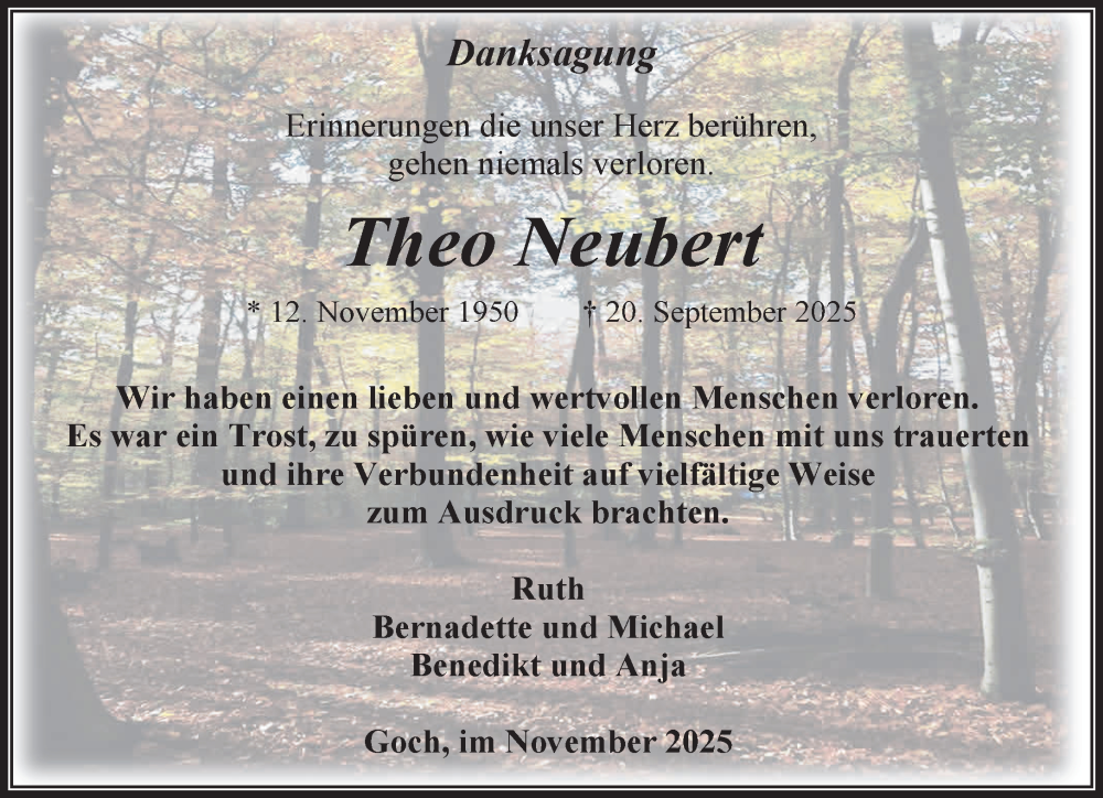 Hier finden Sie alle Traueranzeigen aus der Zeitung, die bisher für Theo Neubert erschienen sind. Weitere Traueranzeigen, die in der Zeitung erscheinen, werden hier ebenfalls aufgelistet