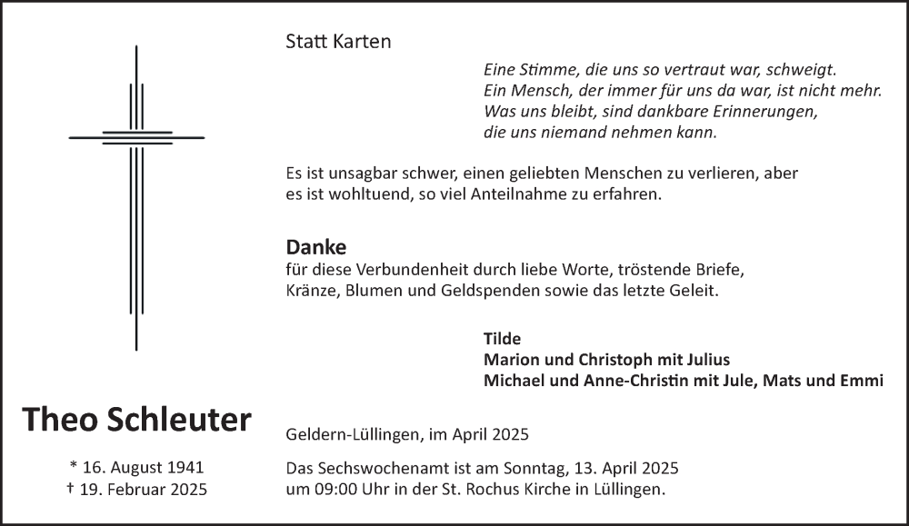 Hier finden Sie alle Traueranzeigen aus der Zeitung, die bisher für Theo Schleuter erschienen sind. Weitere Traueranzeigen, die in der Zeitung erscheinen, werden hier ebenfalls aufgelistet