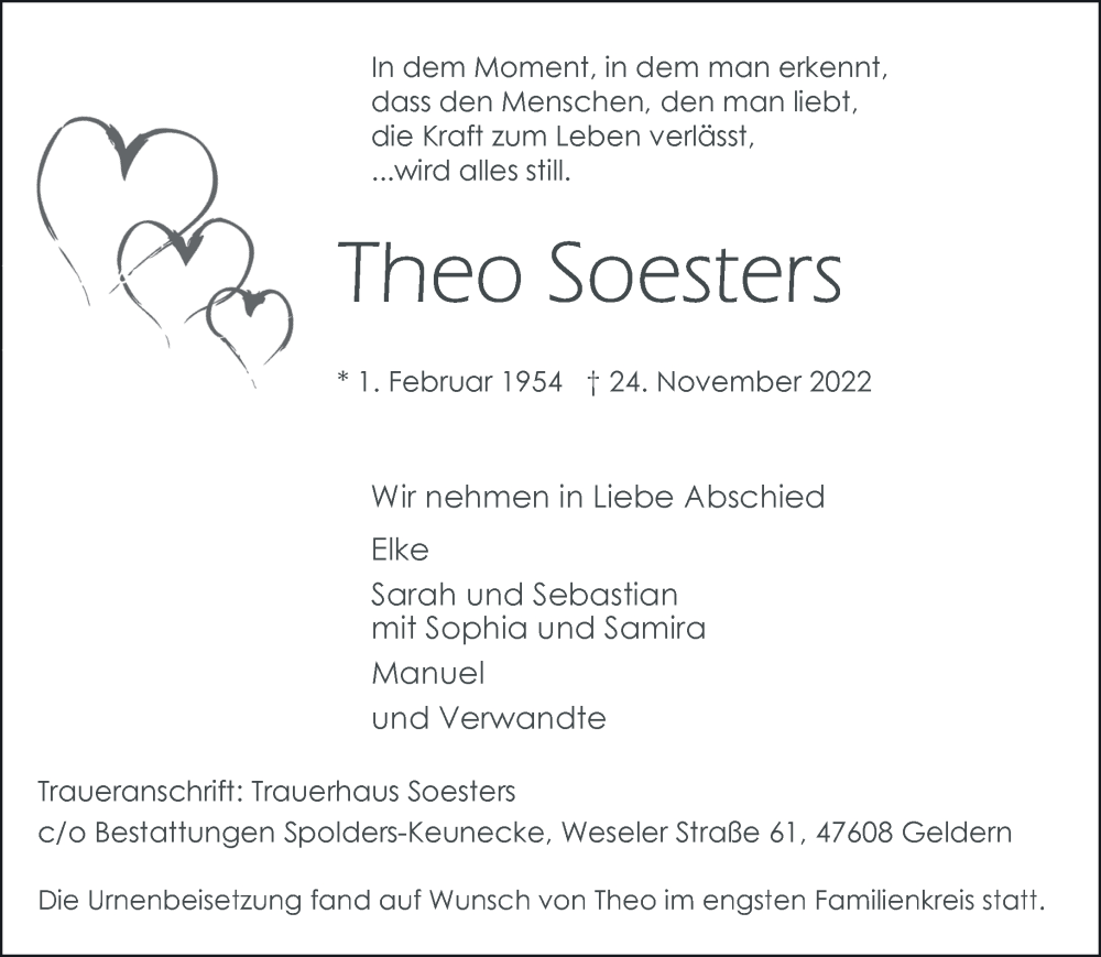 Hier finden Sie alle Traueranzeigen aus der Zeitung, die bisher für Theo Soesters erschienen sind. Weitere Traueranzeigen, die in der Zeitung erscheinen, werden hier ebenfalls aufgelistet