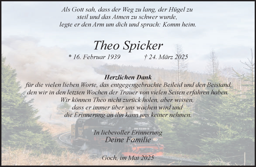 Hier finden Sie alle Traueranzeigen aus der Zeitung, die bisher für Theo Spicker erschienen sind. Weitere Traueranzeigen, die in der Zeitung erscheinen, werden hier ebenfalls aufgelistet