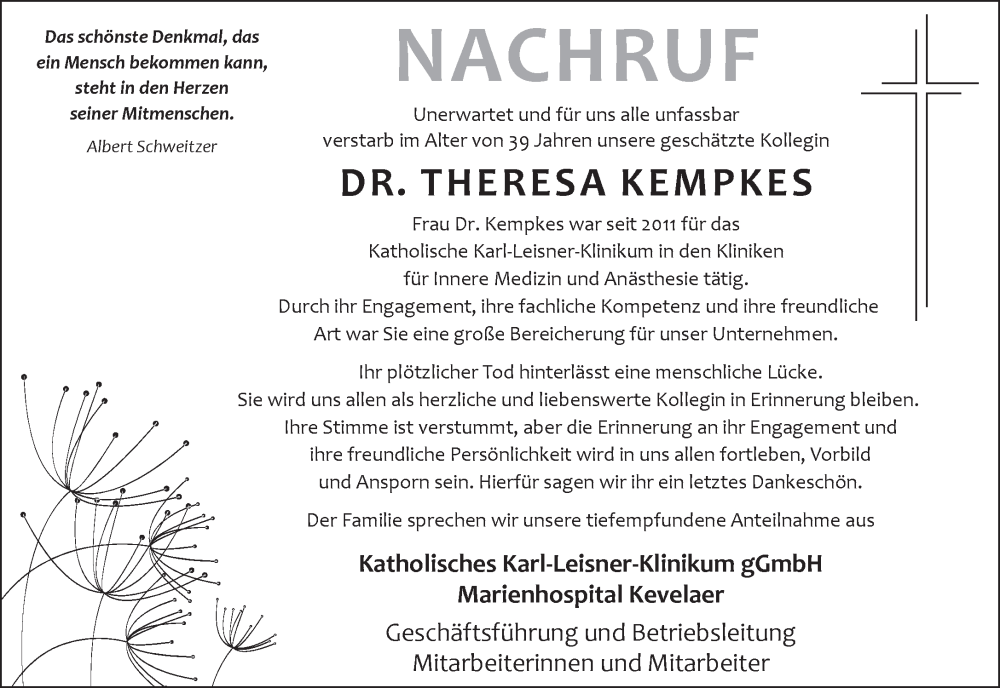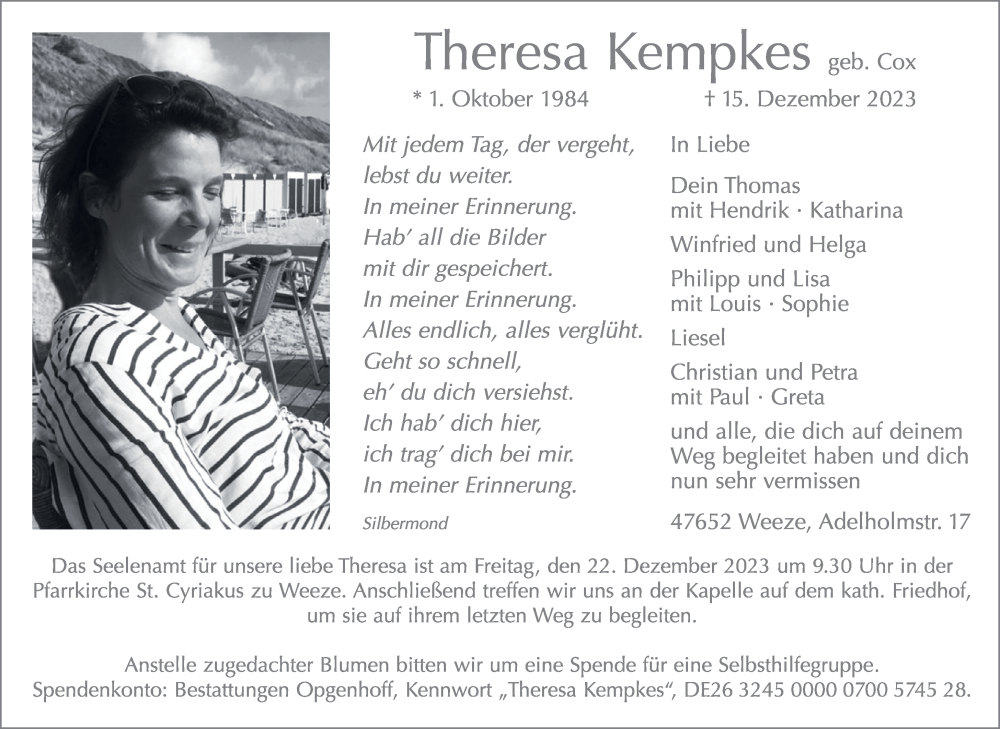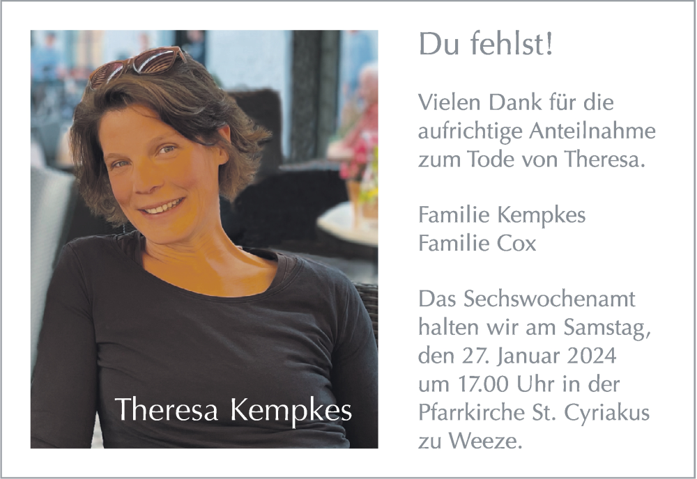 Hier finden Sie alle Traueranzeigen aus der Zeitung, die bisher für Theresa Kempkes erschienen sind. Weitere Traueranzeigen, die in der Zeitung erscheinen, werden hier ebenfalls aufgelistet