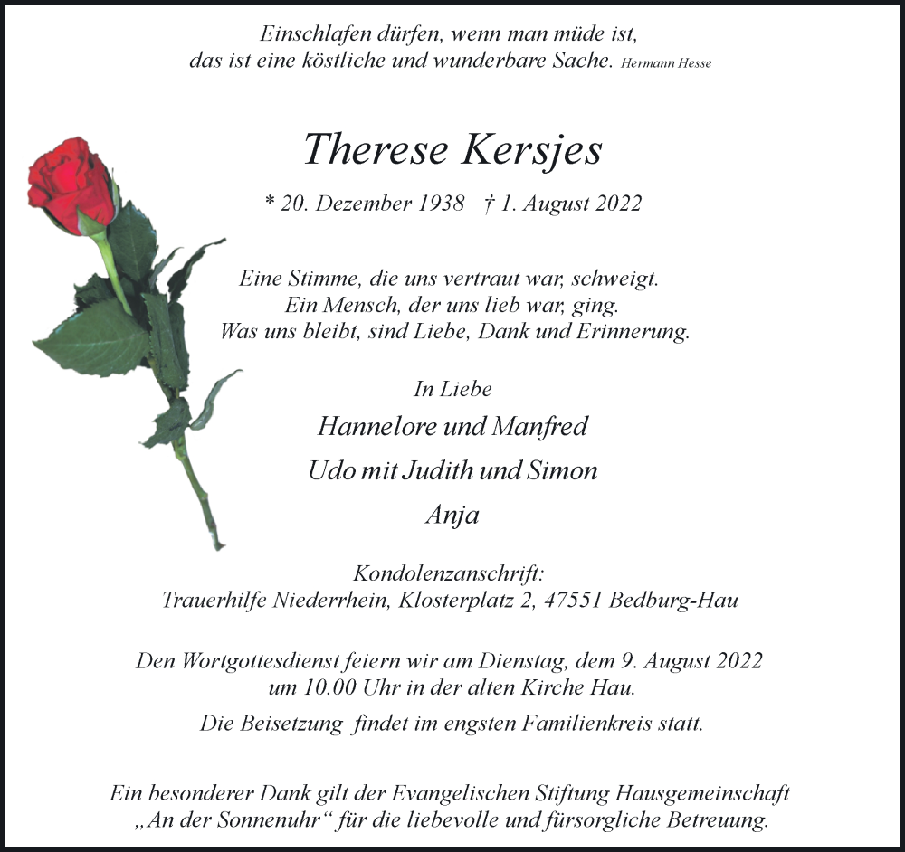 Hier finden Sie alle Traueranzeigen aus der Zeitung, die bisher für Therese Kersjes erschienen sind. Weitere Traueranzeigen, die in der Zeitung erscheinen, werden hier ebenfalls aufgelistet