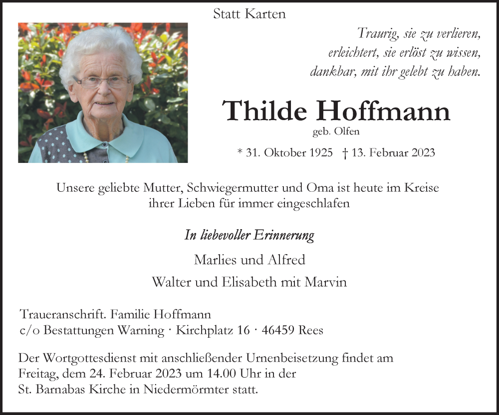 Hier finden Sie alle Traueranzeigen aus der Zeitung, die bisher für Thilde Hoffmann erschienen sind. Weitere Traueranzeigen, die in der Zeitung erscheinen, werden hier ebenfalls aufgelistet
