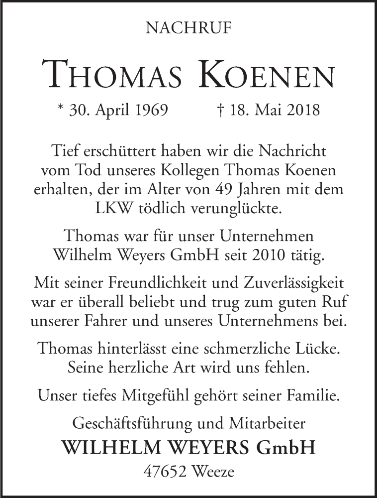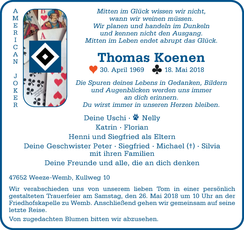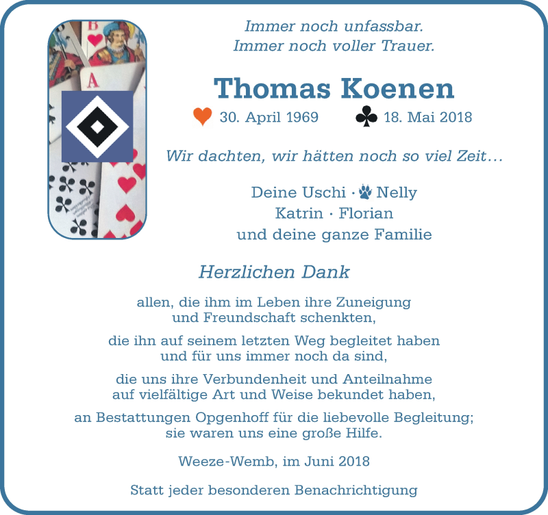 Hier finden Sie alle Traueranzeigen aus der Zeitung, die bisher für Thomas Koenen erschienen sind. Weitere Traueranzeigen, die in der Zeitung erscheinen, werden hier ebenfalls aufgelistet