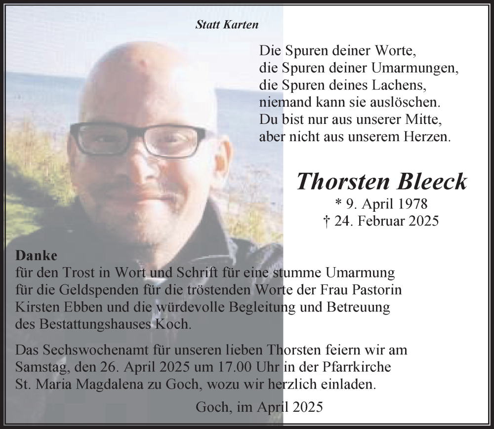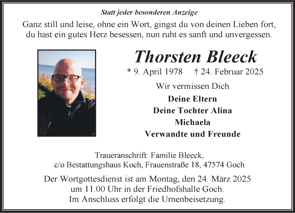 Hier finden Sie alle Traueranzeigen aus der Zeitung, die bisher für Thorsten Bleeck erschienen sind. Weitere Traueranzeigen, die in der Zeitung erscheinen, werden hier ebenfalls aufgelistet