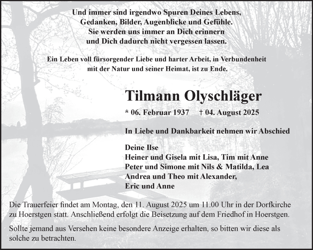 Hier finden Sie alle Traueranzeigen aus der Zeitung, die bisher für Tilmann Olyschläger erschienen sind. Weitere Traueranzeigen, die in der Zeitung erscheinen, werden hier ebenfalls aufgelistet