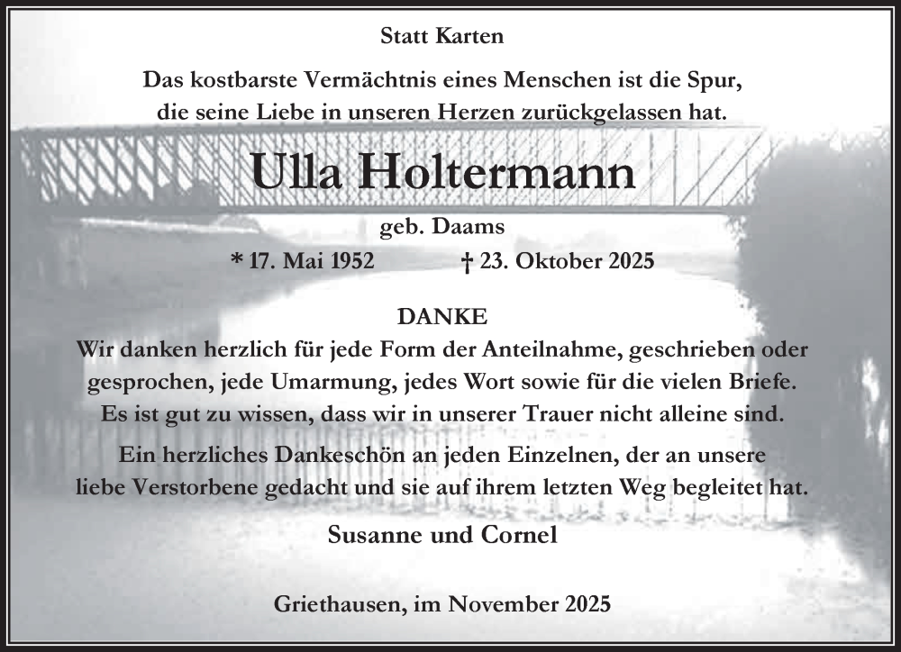 Hier finden Sie alle Traueranzeigen aus der Zeitung, die bisher für Ulla Holtermann erschienen sind. Weitere Traueranzeigen, die in der Zeitung erscheinen, werden hier ebenfalls aufgelistet