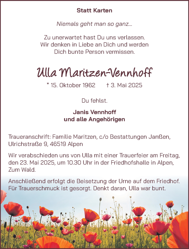 Hier finden Sie alle Traueranzeigen aus der Zeitung, die bisher für Ulla Maritzen-Vennhoff erschienen sind. Weitere Traueranzeigen, die in der Zeitung erscheinen, werden hier ebenfalls aufgelistet