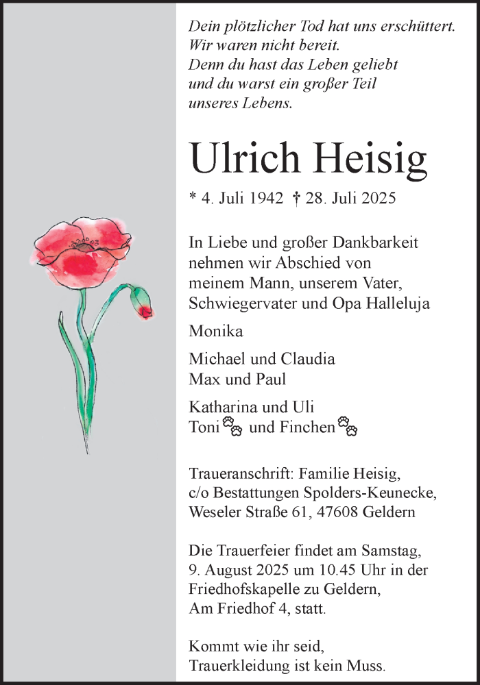 Hier finden Sie alle Traueranzeigen aus der Zeitung, die bisher für Ulrich Heisig erschienen sind. Weitere Traueranzeigen, die in der Zeitung erscheinen, werden hier ebenfalls aufgelistet
