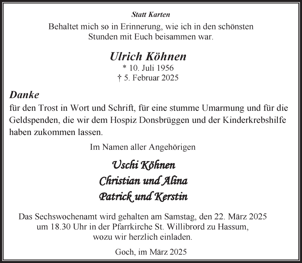 Hier finden Sie alle Traueranzeigen aus der Zeitung, die bisher für Ulrich Köhnen erschienen sind. Weitere Traueranzeigen, die in der Zeitung erscheinen, werden hier ebenfalls aufgelistet