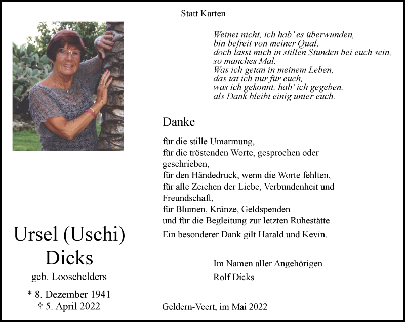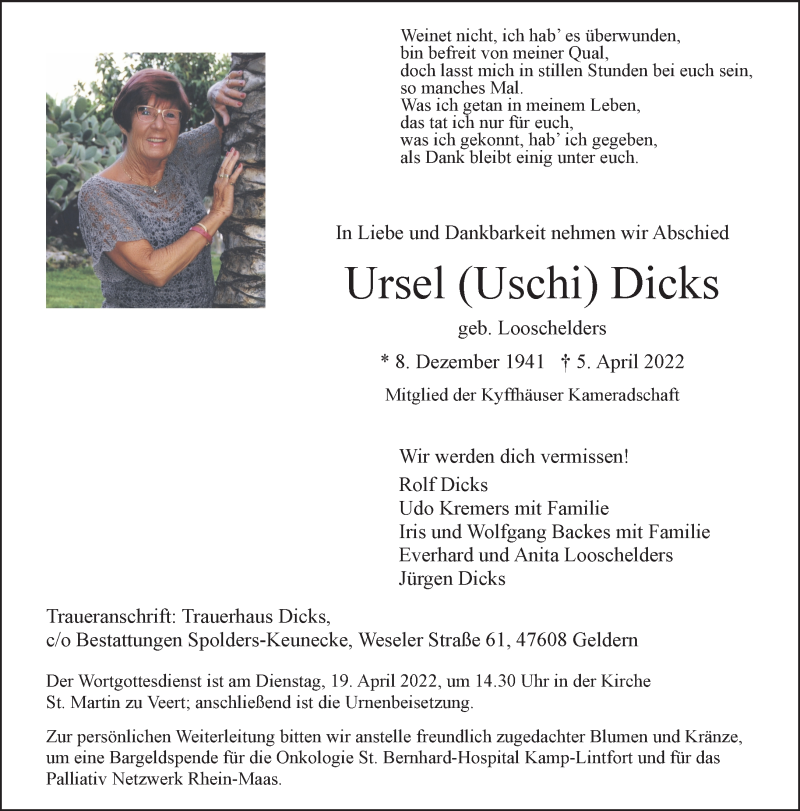 Hier finden Sie alle Traueranzeigen aus der Zeitung, die bisher für Ursel Dicks erschienen sind. Weitere Traueranzeigen, die in der Zeitung erscheinen, werden hier ebenfalls aufgelistet