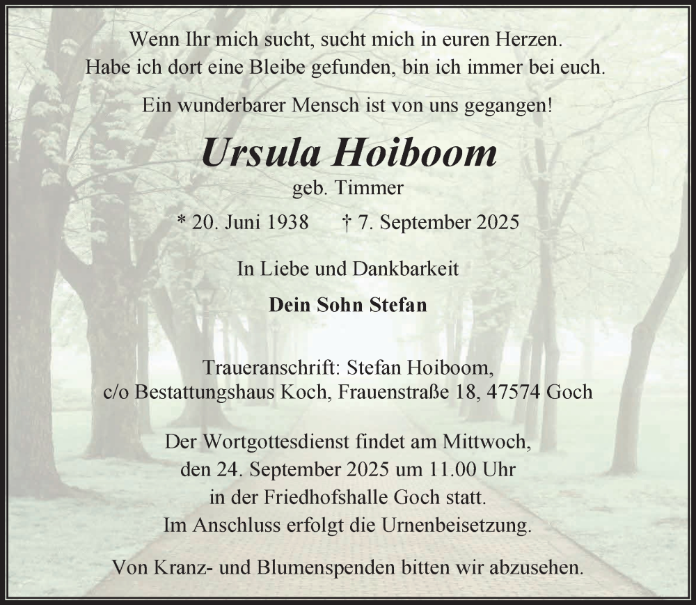 Hier finden Sie alle Traueranzeigen aus der Zeitung, die bisher für Ursula Hoiboom erschienen sind. Weitere Traueranzeigen, die in der Zeitung erscheinen, werden hier ebenfalls aufgelistet