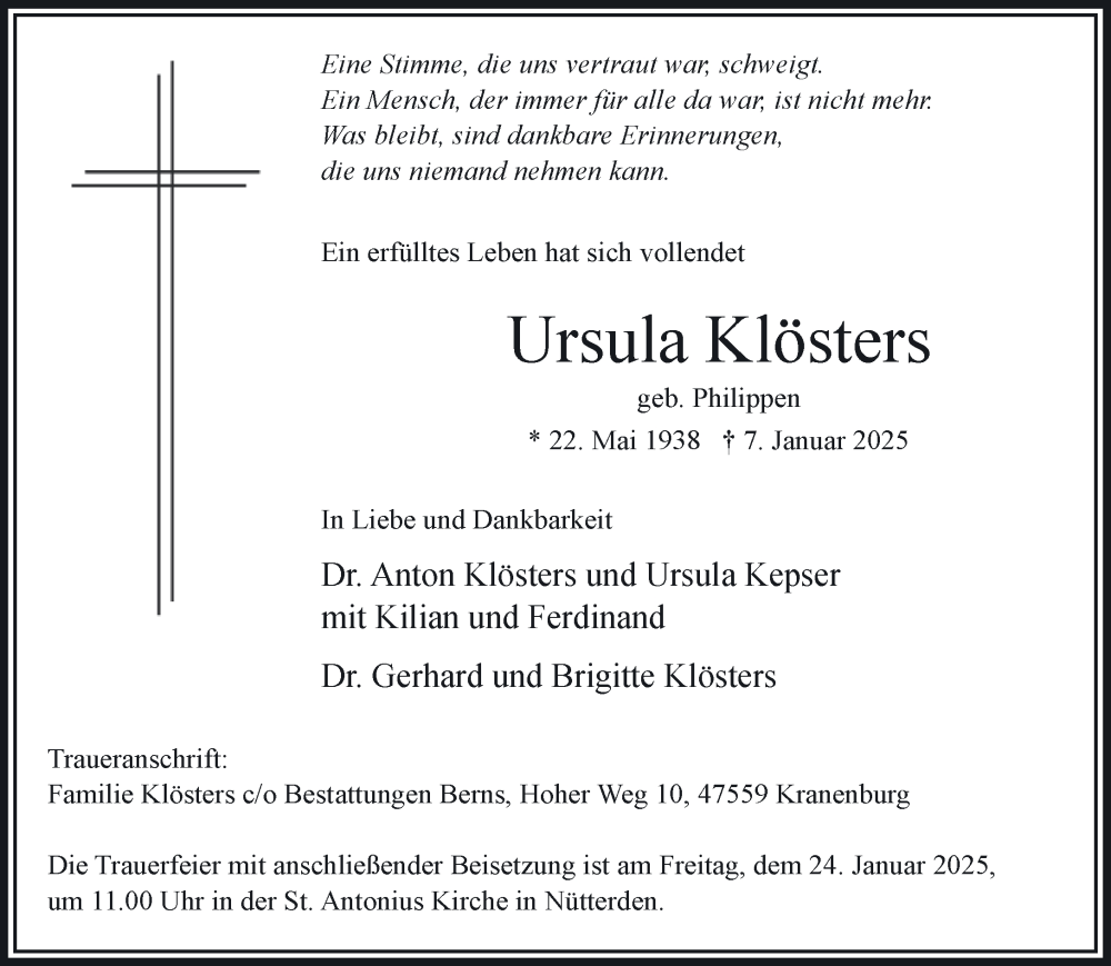 Hier finden Sie alle Traueranzeigen aus der Zeitung, die bisher für Ursula Klösters erschienen sind. Weitere Traueranzeigen, die in der Zeitung erscheinen, werden hier ebenfalls aufgelistet