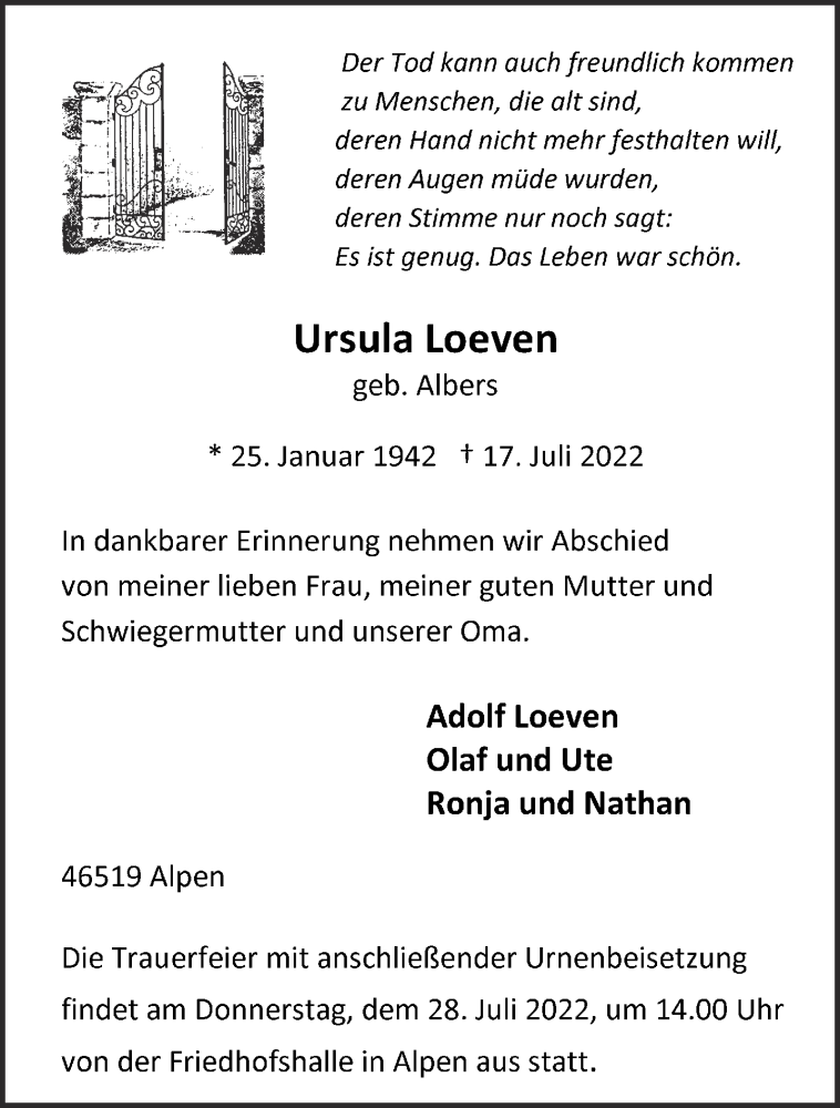Hier finden Sie alle Traueranzeigen aus der Zeitung, die bisher für Ursula Loeven erschienen sind. Weitere Traueranzeigen, die in der Zeitung erscheinen, werden hier ebenfalls aufgelistet