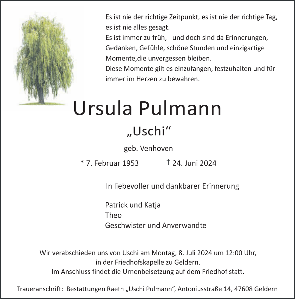 Hier finden Sie alle Traueranzeigen aus der Zeitung, die bisher für Ursula Pulmann erschienen sind. Weitere Traueranzeigen, die in der Zeitung erscheinen, werden hier ebenfalls aufgelistet