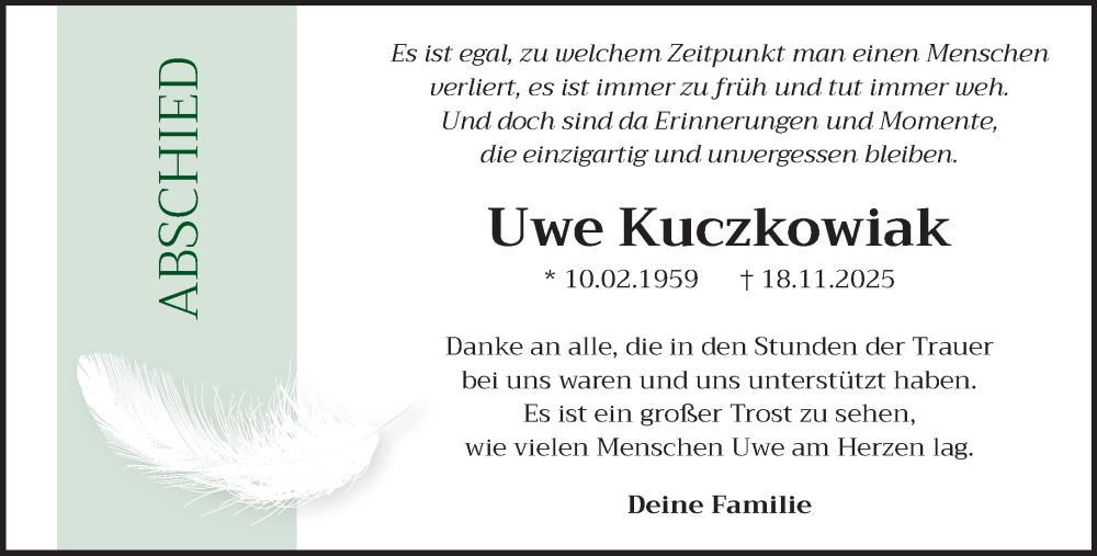 Hier finden Sie alle Traueranzeigen aus der Zeitung, die bisher für Uwe Kuczkowiak erschienen sind. Weitere Traueranzeigen, die in der Zeitung erscheinen, werden hier ebenfalls aufgelistet