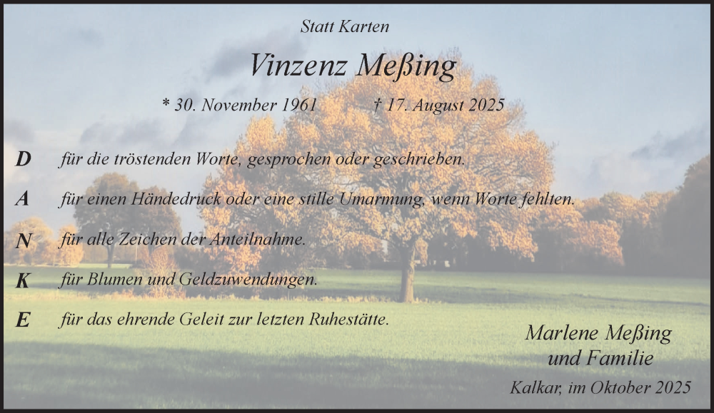 Hier finden Sie alle Traueranzeigen aus der Zeitung, die bisher für Vinzenz Meßing erschienen sind. Weitere Traueranzeigen, die in der Zeitung erscheinen, werden hier ebenfalls aufgelistet