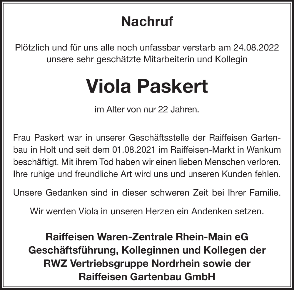 Hier finden Sie alle Traueranzeigen aus der Zeitung, die bisher für Viola Paskert erschienen sind. Weitere Traueranzeigen, die in der Zeitung erscheinen, werden hier ebenfalls aufgelistet