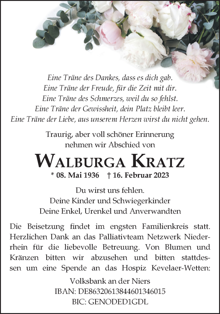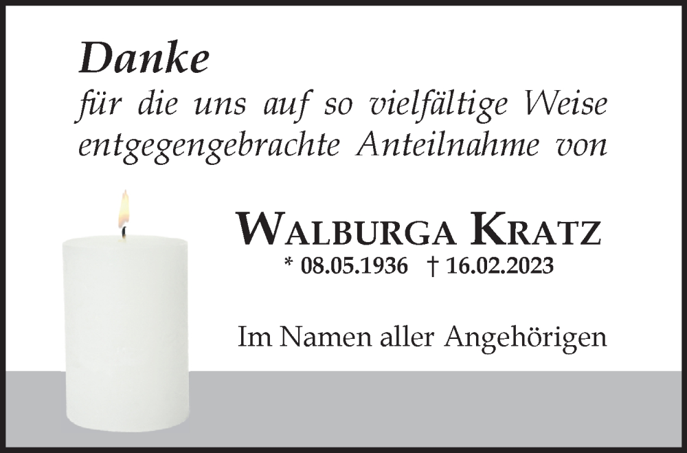 Hier finden Sie alle Traueranzeigen aus der Zeitung, die bisher für Walburga Kratz erschienen sind. Weitere Traueranzeigen, die in der Zeitung erscheinen, werden hier ebenfalls aufgelistet