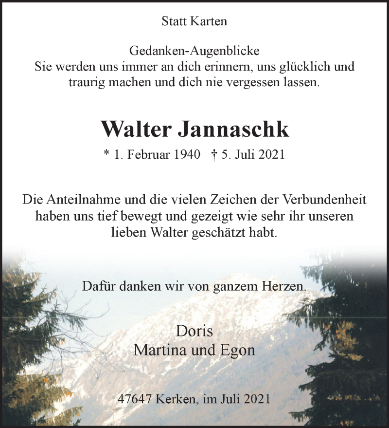 Hier finden Sie alle Traueranzeigen aus der Zeitung, die bisher für Walter Jannaschk erschienen sind. Weitere Traueranzeigen, die in der Zeitung erscheinen, werden hier ebenfalls aufgelistet