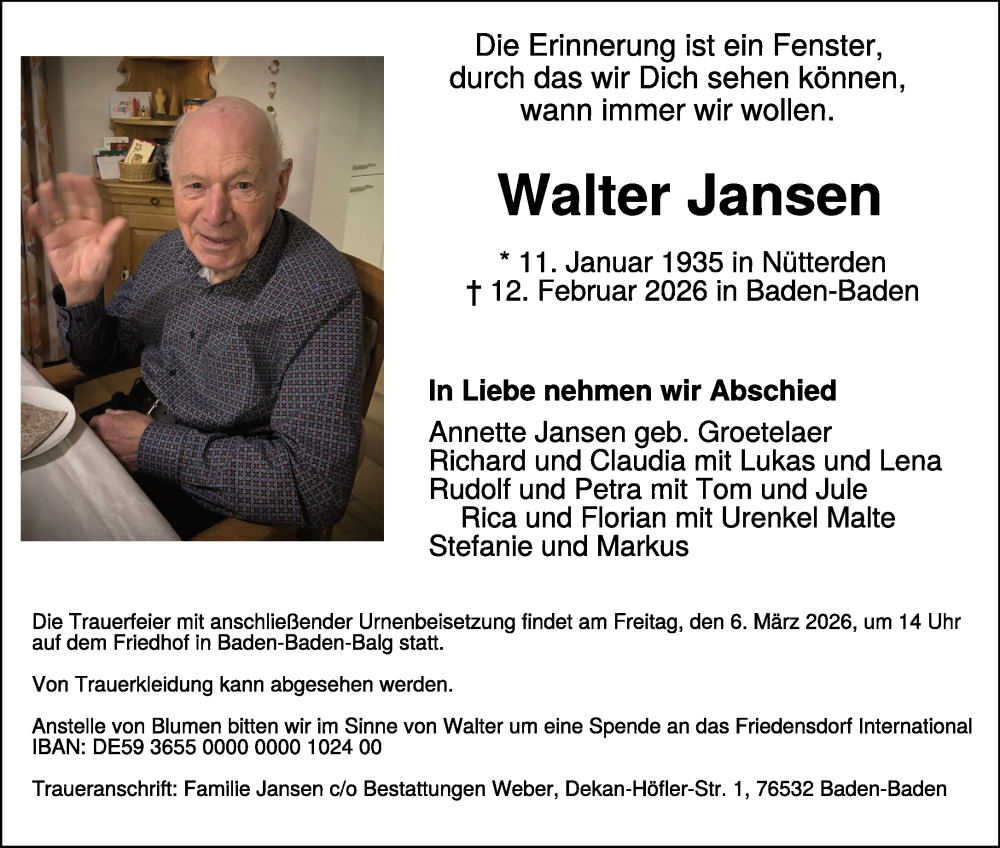 Hier finden Sie alle Traueranzeigen aus der Zeitung, die bisher für Walter Jansen erschienen sind. Weitere Traueranzeigen, die in der Zeitung erscheinen, werden hier ebenfalls aufgelistet