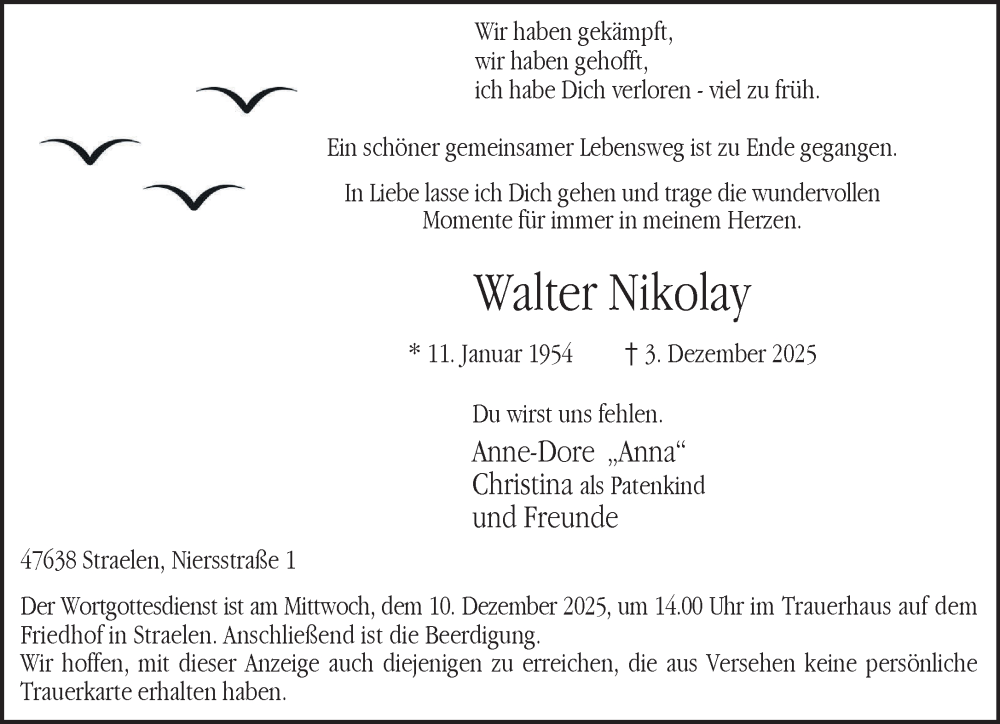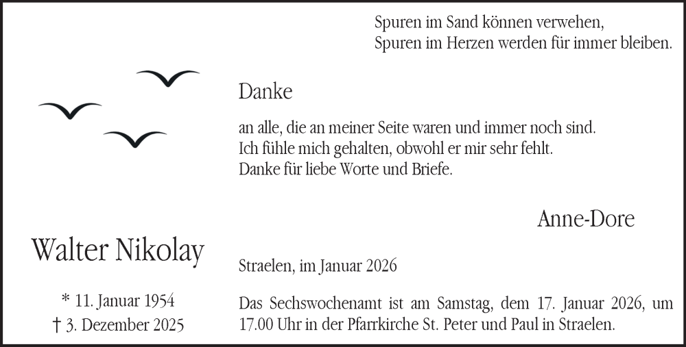 Hier finden Sie alle Traueranzeigen aus der Zeitung, die bisher für Walter Nikolay erschienen sind. Weitere Traueranzeigen, die in der Zeitung erscheinen, werden hier ebenfalls aufgelistet