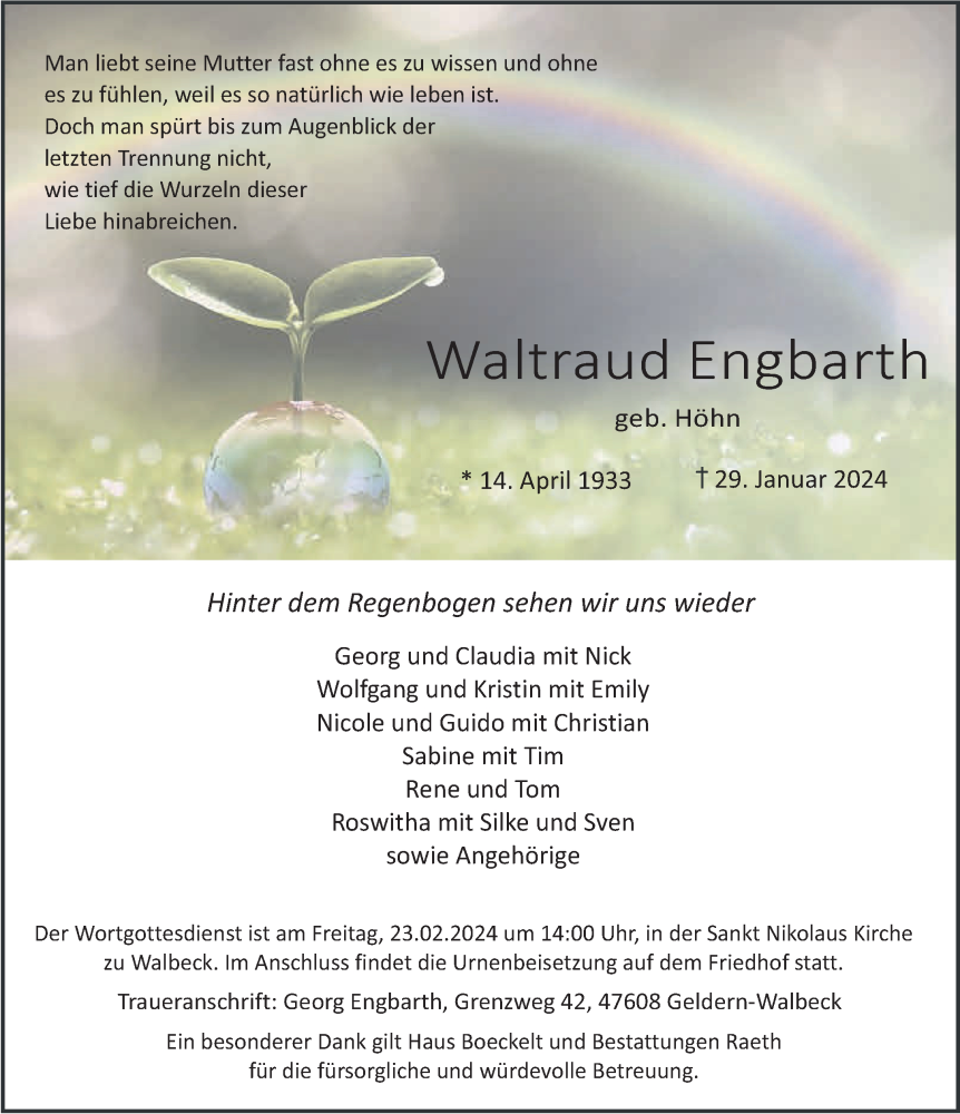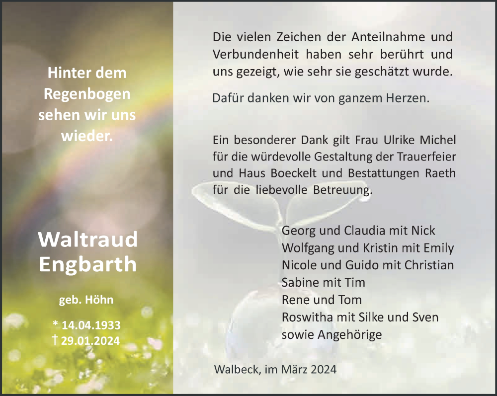Hier finden Sie alle Traueranzeigen aus der Zeitung, die bisher für Waltraud Engbarth erschienen sind. Weitere Traueranzeigen, die in der Zeitung erscheinen, werden hier ebenfalls aufgelistet
