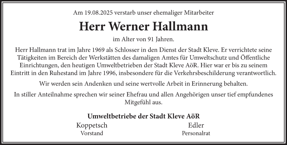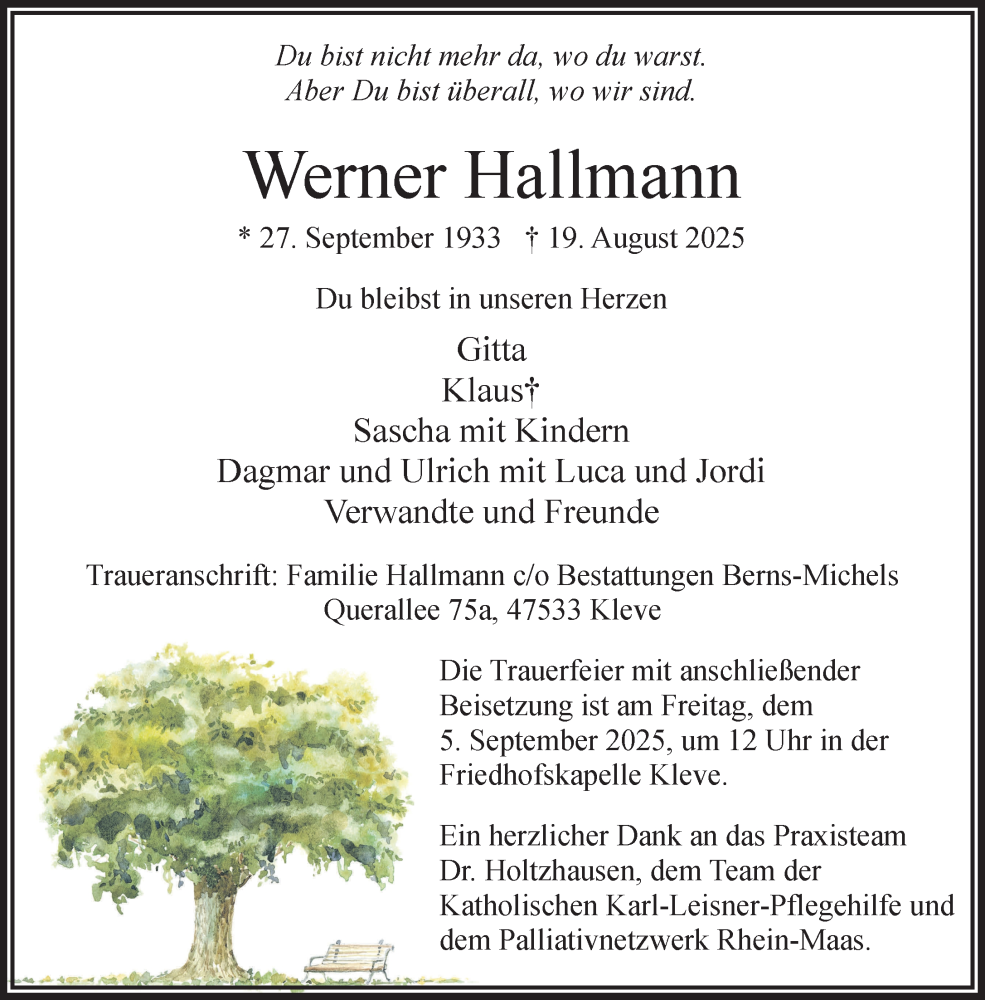 Hier finden Sie alle Traueranzeigen aus der Zeitung, die bisher für Werner Hallmann erschienen sind. Weitere Traueranzeigen, die in der Zeitung erscheinen, werden hier ebenfalls aufgelistet
