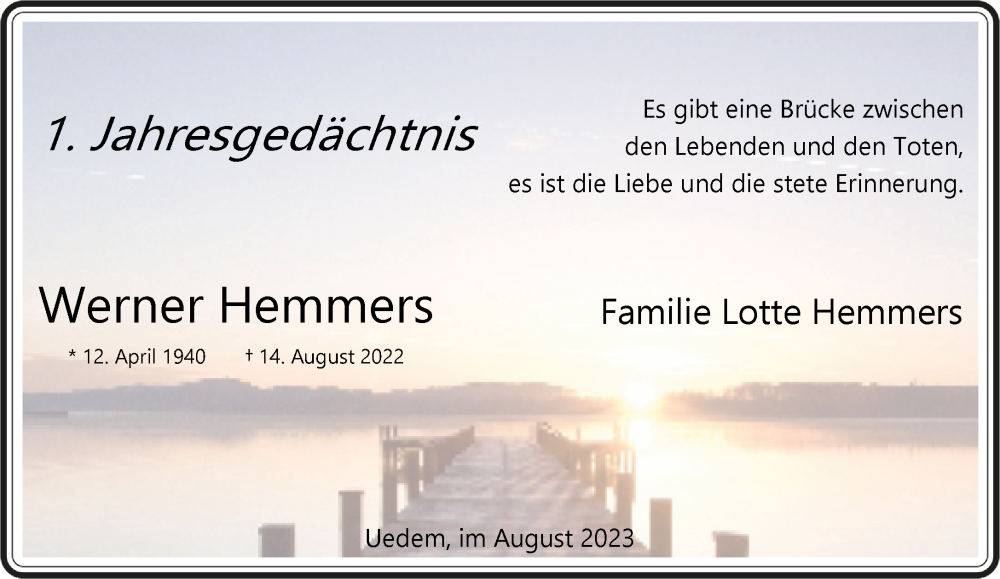 Hier finden Sie alle Traueranzeigen aus der Zeitung, die bisher für Werner Hemmers erschienen sind. Weitere Traueranzeigen, die in der Zeitung erscheinen, werden hier ebenfalls aufgelistet