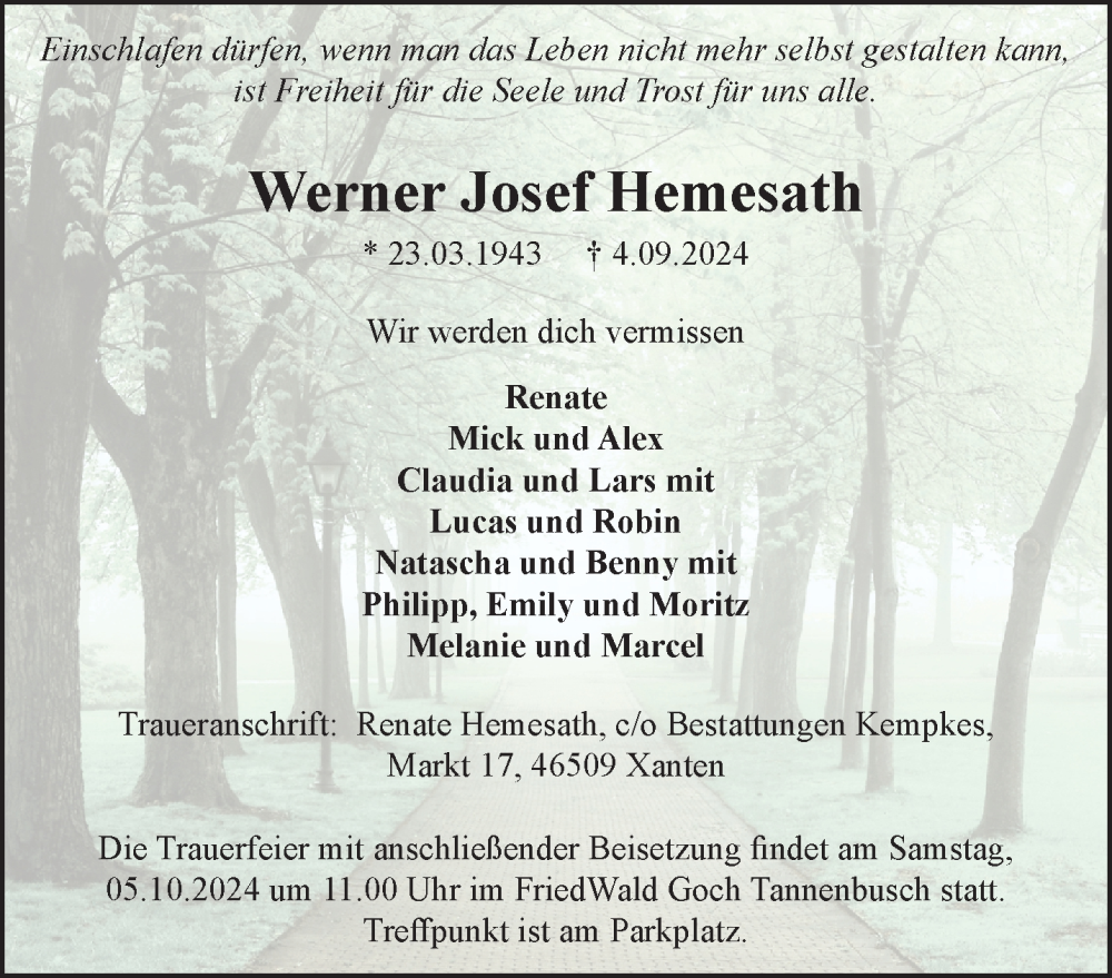 Hier finden Sie alle Traueranzeigen aus der Zeitung, die bisher für Werner Josef Hemesath erschienen sind. Weitere Traueranzeigen, die in der Zeitung erscheinen, werden hier ebenfalls aufgelistet