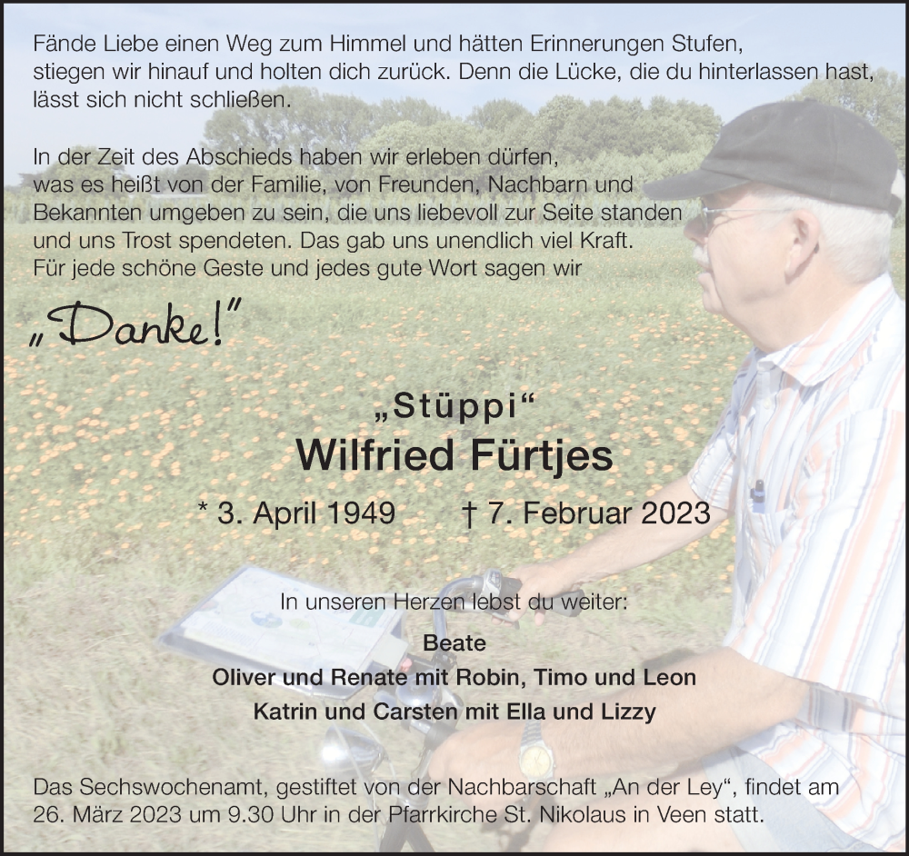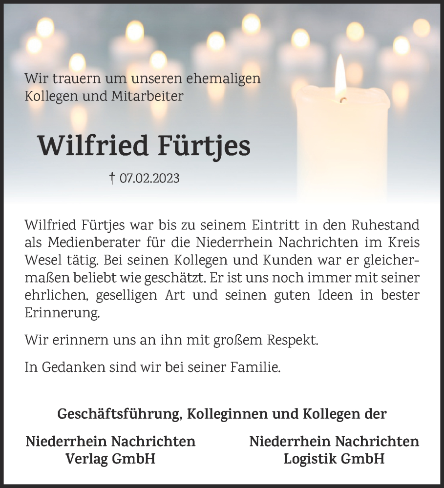 Hier finden Sie alle Traueranzeigen aus der Zeitung, die bisher für Wilfried Fürtjes erschienen sind. Weitere Traueranzeigen, die in der Zeitung erscheinen, werden hier ebenfalls aufgelistet