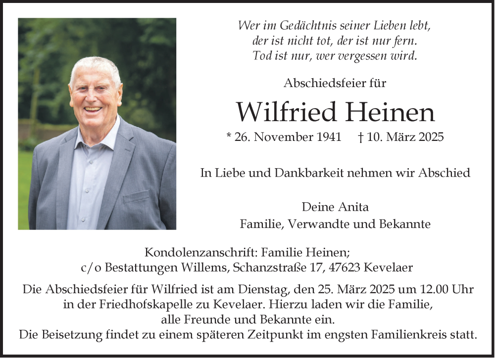 Hier finden Sie alle Traueranzeigen aus der Zeitung, die bisher für Wilfried Heinen erschienen sind. Weitere Traueranzeigen, die in der Zeitung erscheinen, werden hier ebenfalls aufgelistet