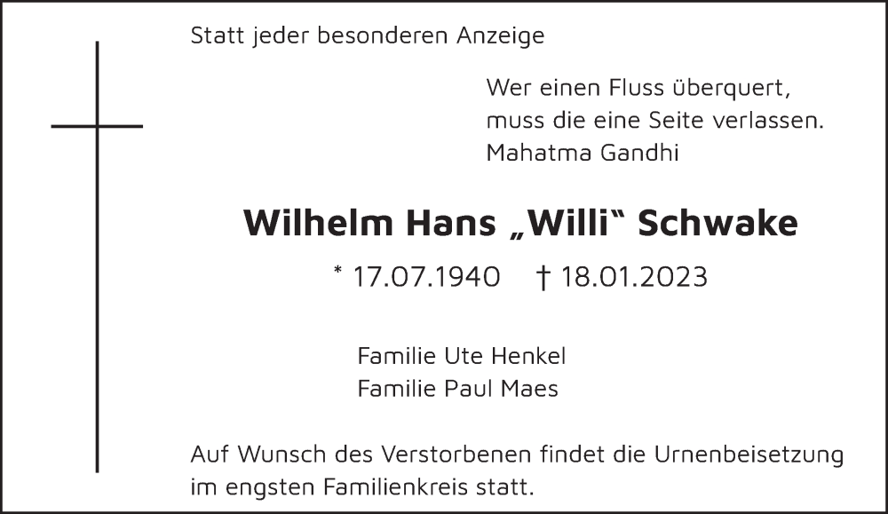 Hier finden Sie alle Traueranzeigen aus der Zeitung, die bisher für Wilhelm Hans Schwake erschienen sind. Weitere Traueranzeigen, die in der Zeitung erscheinen, werden hier ebenfalls aufgelistet
