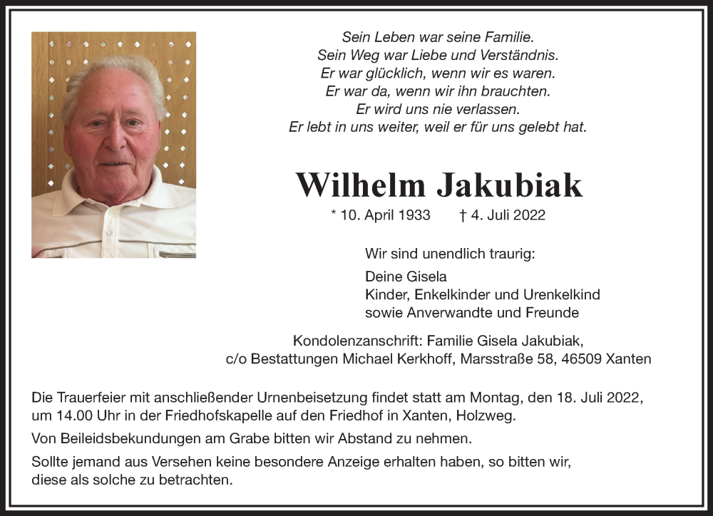 Hier finden Sie alle Traueranzeigen aus der Zeitung, die bisher für Wilhelm Jakubiak erschienen sind. Weitere Traueranzeigen, die in der Zeitung erscheinen, werden hier ebenfalls aufgelistet