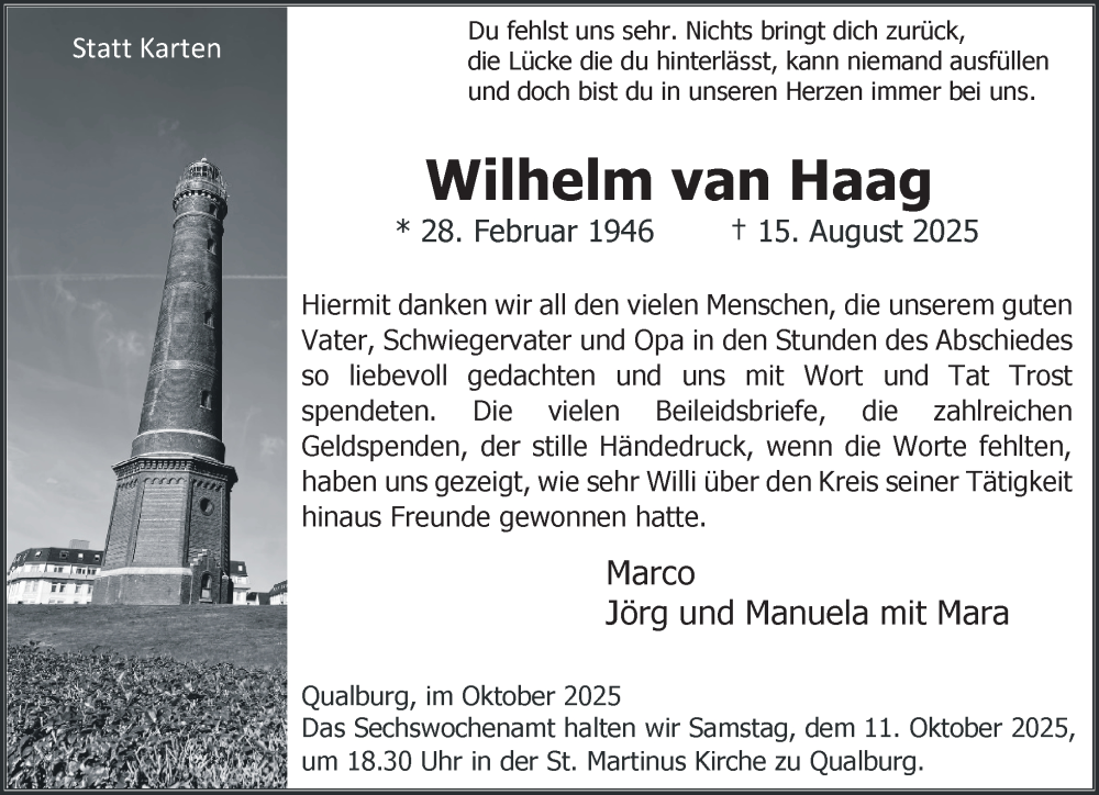 Hier finden Sie alle Traueranzeigen aus der Zeitung, die bisher für Wilhelm van Haag erschienen sind. Weitere Traueranzeigen, die in der Zeitung erscheinen, werden hier ebenfalls aufgelistet
