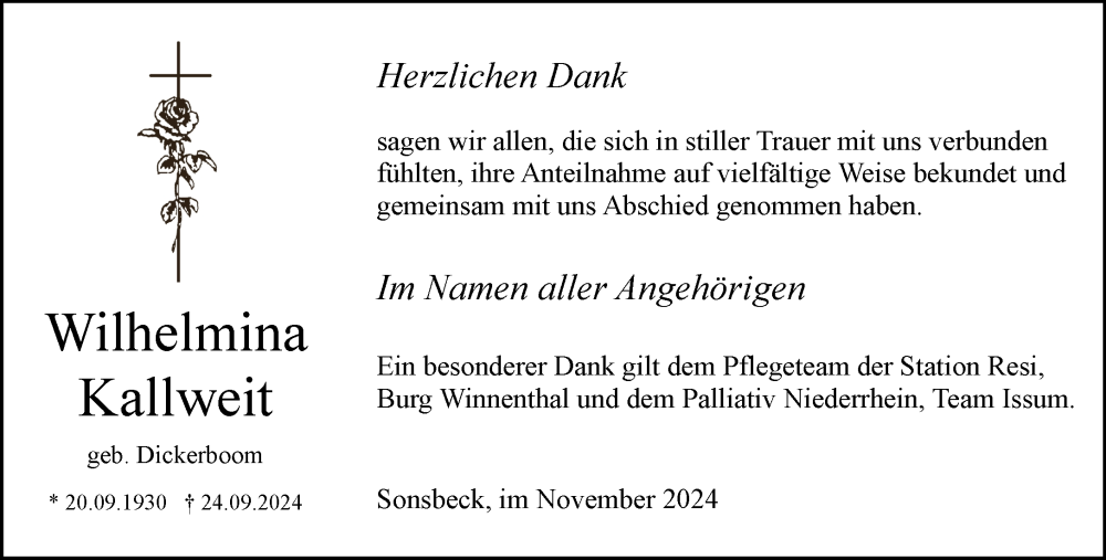 Hier finden Sie alle Traueranzeigen aus der Zeitung, die bisher für Wilhelmina Kallweit erschienen sind. Weitere Traueranzeigen, die in der Zeitung erscheinen, werden hier ebenfalls aufgelistet