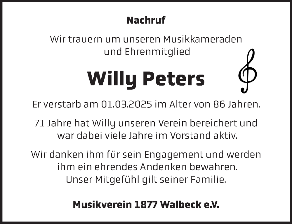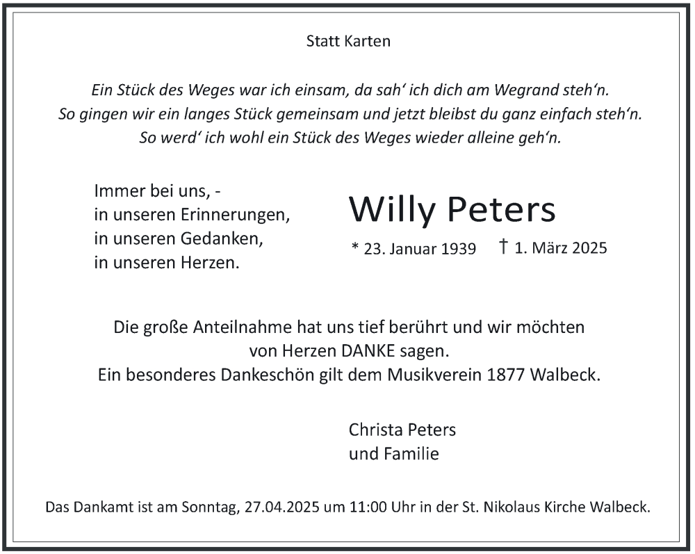 Hier finden Sie alle Traueranzeigen aus der Zeitung, die bisher für Willy Peters erschienen sind. Weitere Traueranzeigen, die in der Zeitung erscheinen, werden hier ebenfalls aufgelistet